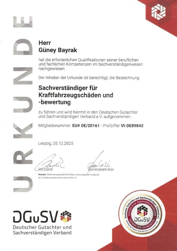 Mein Name ist Güney Bayrak. Ich bin Maschinenbauingenieur und zertifizierter Kfz-Sachverständiger aus Oberhausen.